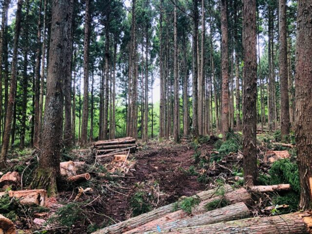 山林のお手入れ方法の一種で、樹木を切り倒す作業のことです。